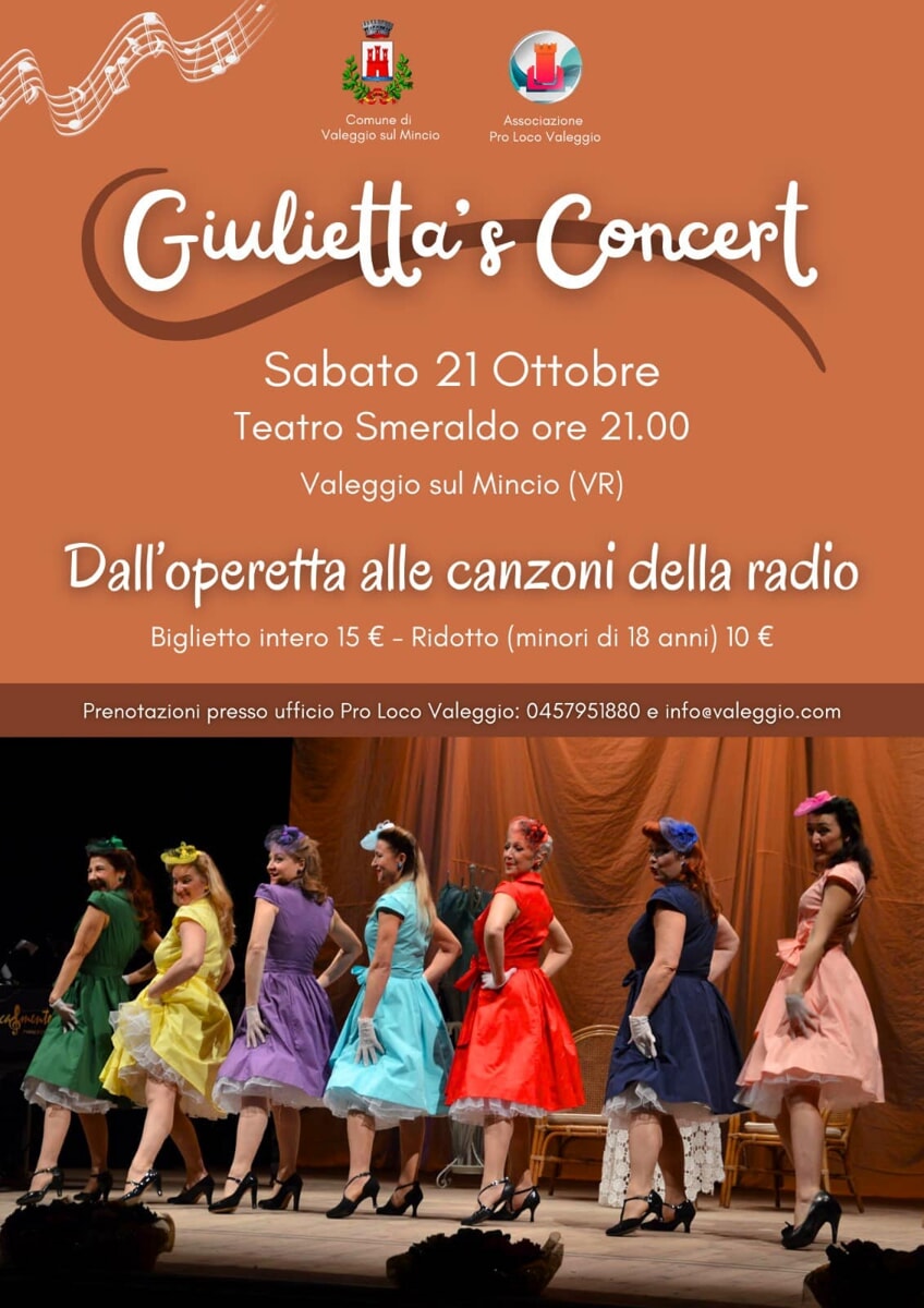 Un appuntamento da non perdere per gli amanti della lirica di un tempo: sabato 21 ottobre alle ore 21 al Teatro Smeraldo di Valeggio sul Mincio va in scena “Giulietta’s Concert”, un complesso formato da cantanti liriche (tre soprani e tre mezzosoprani) e da una pianista, tutte professioniste che…