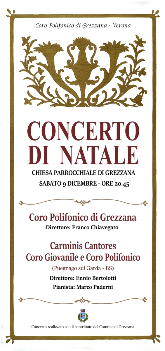 L’amministrazione comunale, anche quest’anno, supporta la Parrocchia di Grezzana per il Concerto di Natale che si terrà sabato 9 dicembre alle 20.45 nella Chiesa Parrocchiale. Il concerto è organizzato dal Coro Polifonico di Grezzana diretto dal Maestro Franco Chiavegato. Per quest’anno, il coro…