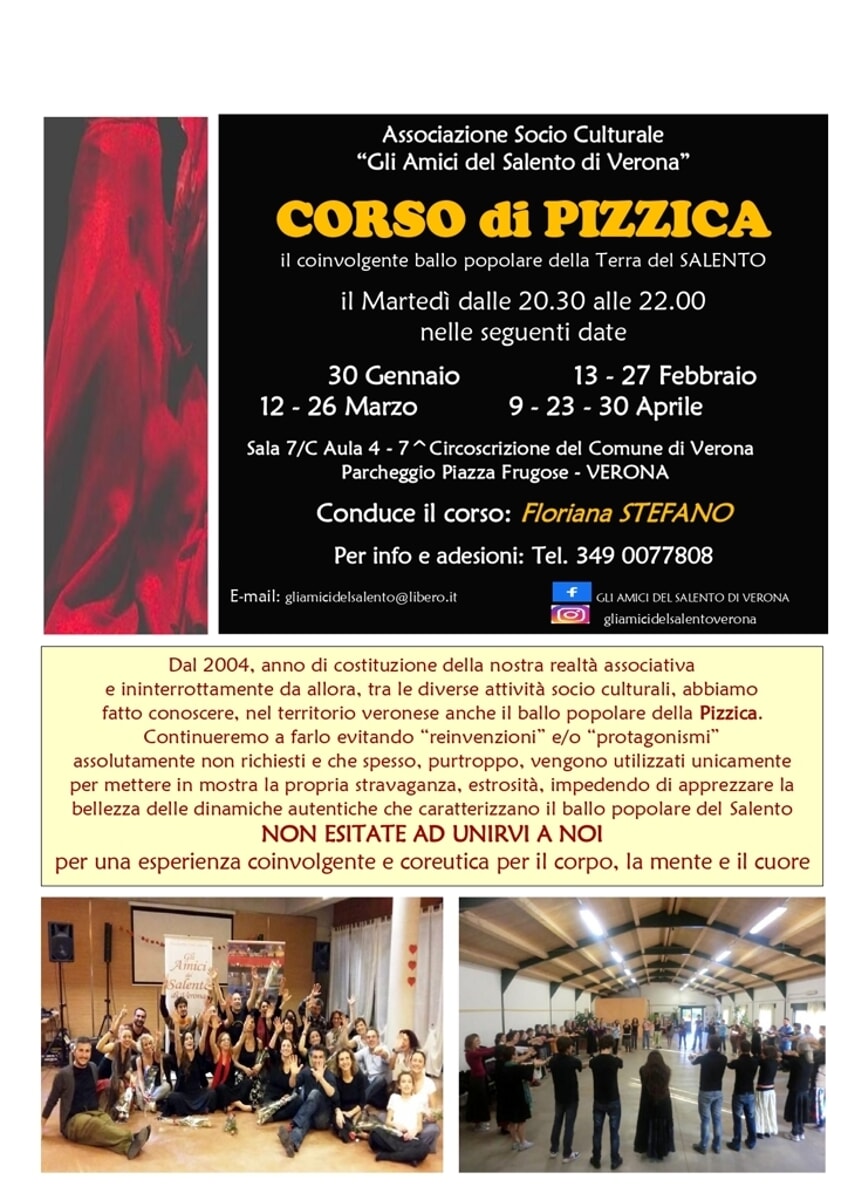 Corso di pizzica con l’associazione “Gli amici del Salento di Verona”: «Noi dell’associazione socio culturale “Gli Amici del Salento di Verona” non ci sentiamo per nulla “colpevoli” se ormai da 20 anni, anche a Verona, si balla la “Pizzica”, anzi siamo felicissimi di averla fatta conoscere nel…
