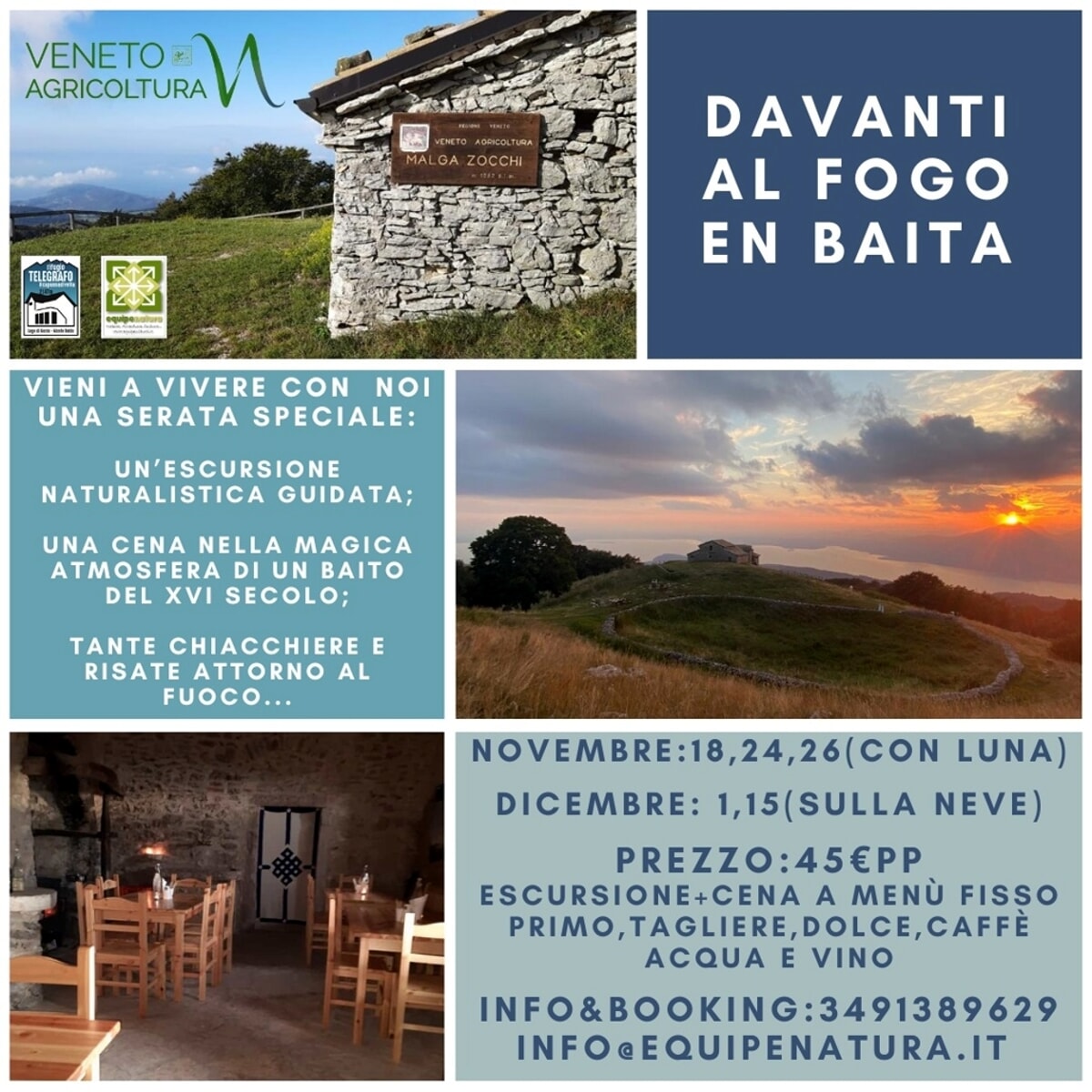 Inverno, giornate sempre più corte, temperature sempre più pungenti. Il fuoco è luce, calore…magia! Vi aspettiamo a partire da sabato 18 novembre sera per delle escursioni sul Monte Baldo a vista Lago di Garda con cena nella magica atmosfera di un baito del XVI secolo!