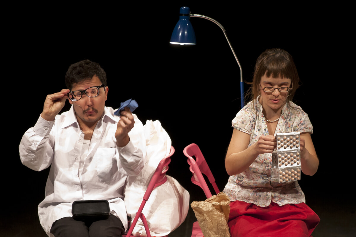 Cri e Pe, due piccoli esseri umani, un uomo e una donna dalle fattezze ridotte, non possono muoversi, atterriti dalla paura di un fuori sconosciuto. Cosa sono i desideri? Di cosa ha bisogno l’uomo per essere felice? Se lo chiedono i due interpreti di Due passi sono, una favola poetica di 45…