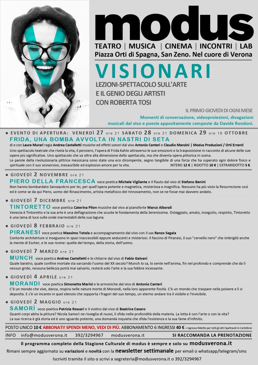 Giunge alla sua seconda edizione il Percorso proposto dal Teatro Modus in collaborazione con la critica d’arte Roberta Tosi dal titolo “Visionari”, una serie di conferenze-spettacolo sull’arte ed artisti che ne hanno cambiato il corso della storia. Giovedì 2 novembre ore 21 apre il ciclo Piero…
