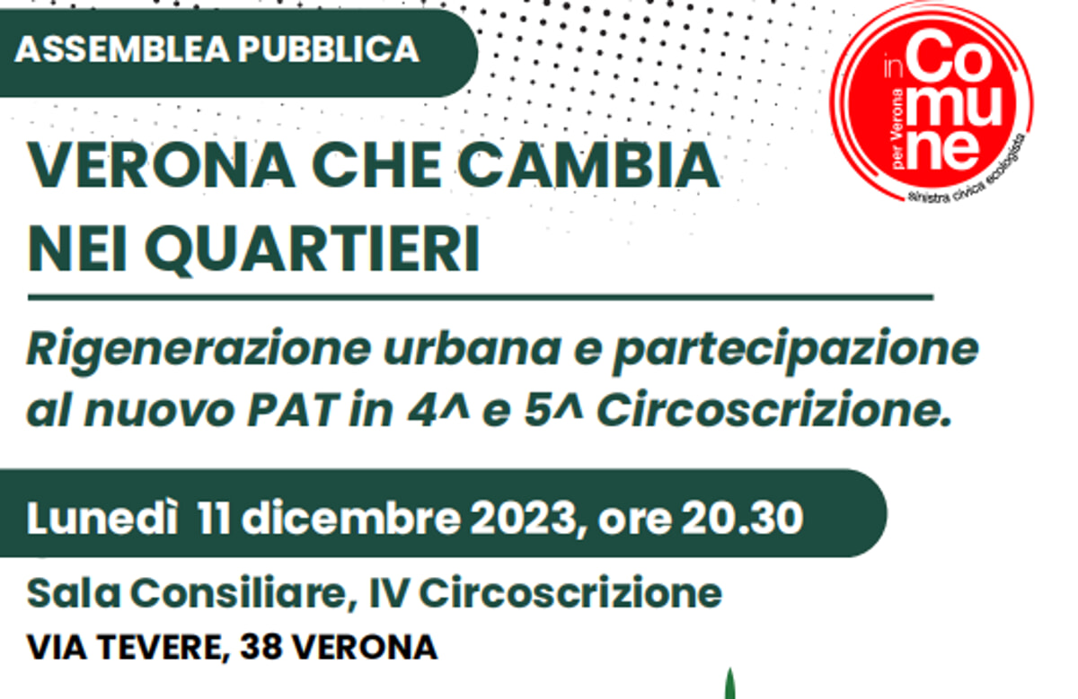 Nell’ambito del processo democratico di condivisione degli obiettivi e delle priorità del nuovo Piano di assetto del territorio (Pat), di cui l’amministrazione comunale ha avviato l’iter, questa sera, 11 dicembre, alle 20.30 nella sala consiliare della quarta circoscrizione in Via Tevere 38 a…
