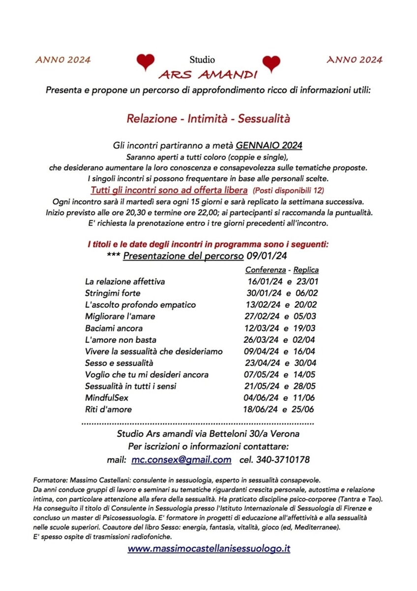 Un percorso di approfondimento ricco di informazioni, aperto a coppie e a single che desiderano aumentare la loro consapevolezza sulle tematiche proposte. Questo è il primo incontro di una serie di dodici a partire dal 23 gennaio 2024.