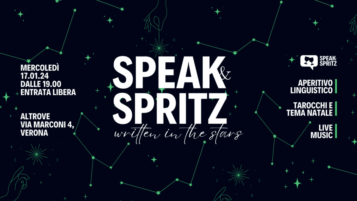 Speak and Spritz, l’aperitivo linguistico del vostro cuore, ritorna in veste “Written in the stars”, per una serata all’insegna delle stelle, dei segni, dei desideri per il nuovo anno. Ci vediamo da Altrove (Via Marconi 4, Verona) mercoledì 17 gennaio a partire dalle 19, con le nostre solite…
