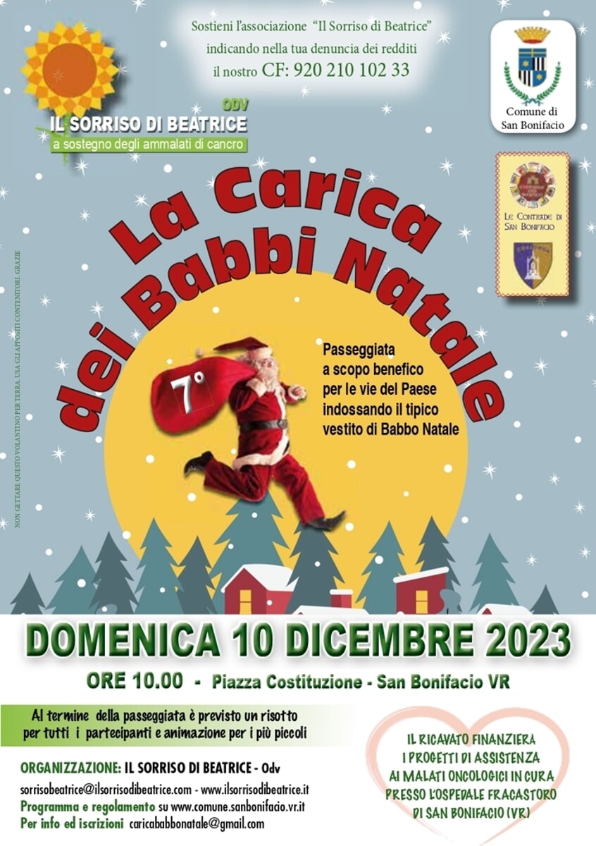 Una tradizione di solidarietà. Da sette anni la Odv Il sorriso di Beatrice, assieme al Comune di San Bonifacio e con la collaborazione delle Contrade e del Comitato Coalonga, porta avanti questa iniziativa che propone una passeggiata nei panni di Babbo Natale come modalità festosa per manifestare…