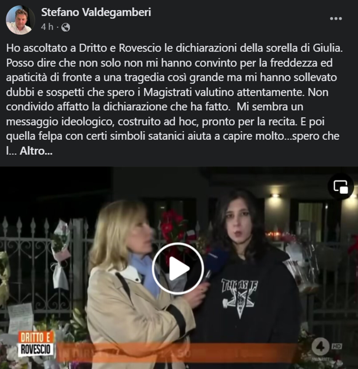 Sta scatenando reazioni anche verbalmente violente il commento condiviso dal consigliere regionale veronese Stefano Valdegamberi sulle dichiarazioni rilasciate al programma Dritto e Rovescio da Elena Cecchettin, sorella della 22enne uccisa dell’ex fidanzato Filippo Turetta.