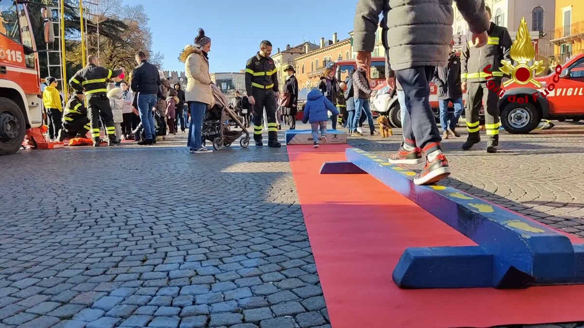 Vigili del fuoco in piazza Brà con attrezzature, mezzi e un percorso per bambini per aiutare Telethon